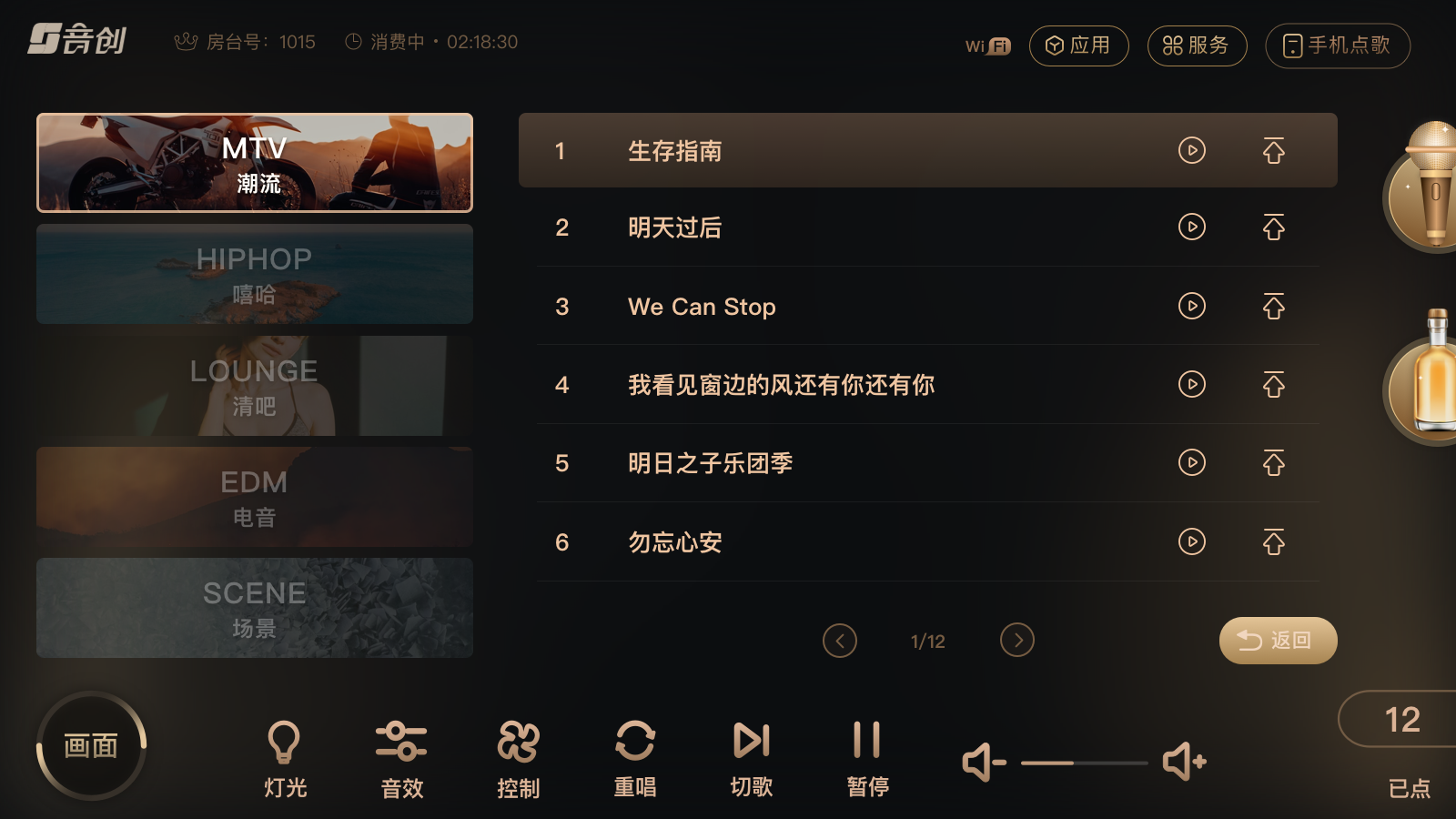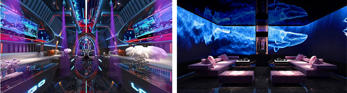 “潮流、嘻哈、清吧、电音、场景”五大曲风定制歌单,通过声光影的联动,为用户展现不同的包厢音视听氛围,满足消费者更加国际化的娱乐需求和品味。