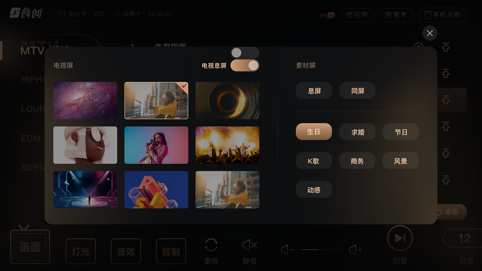 顾客如果不喜欢预设歌单中的电视屏或素材屏画面,可在【画面】选择界面中选择新的视频画面进行替换更多丰富视频素材,满足消费者与众不同的个性偏好和场景应用需求。