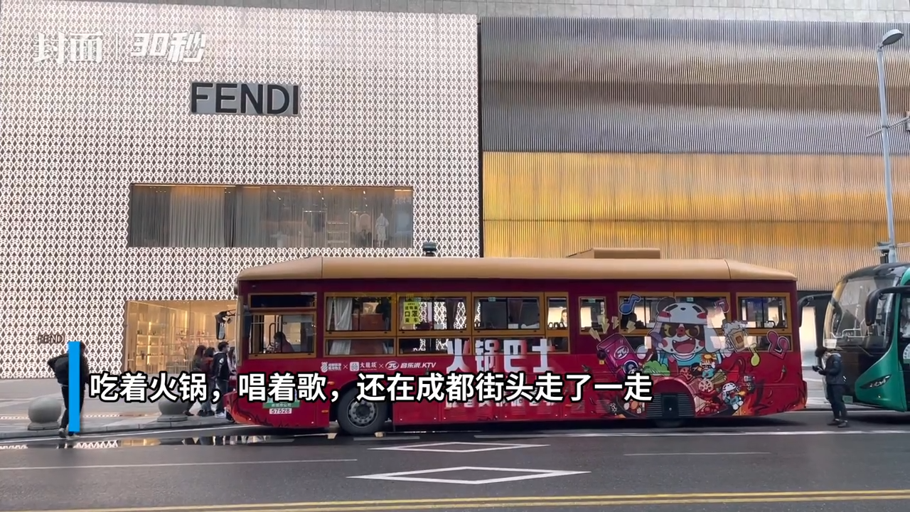 “吃着火锅,唱着歌”。一辆由公交车改成的火锅巴士亮相成都春熙路,以辣椒红为主体颜色,火锅的氛围一下就来了。
