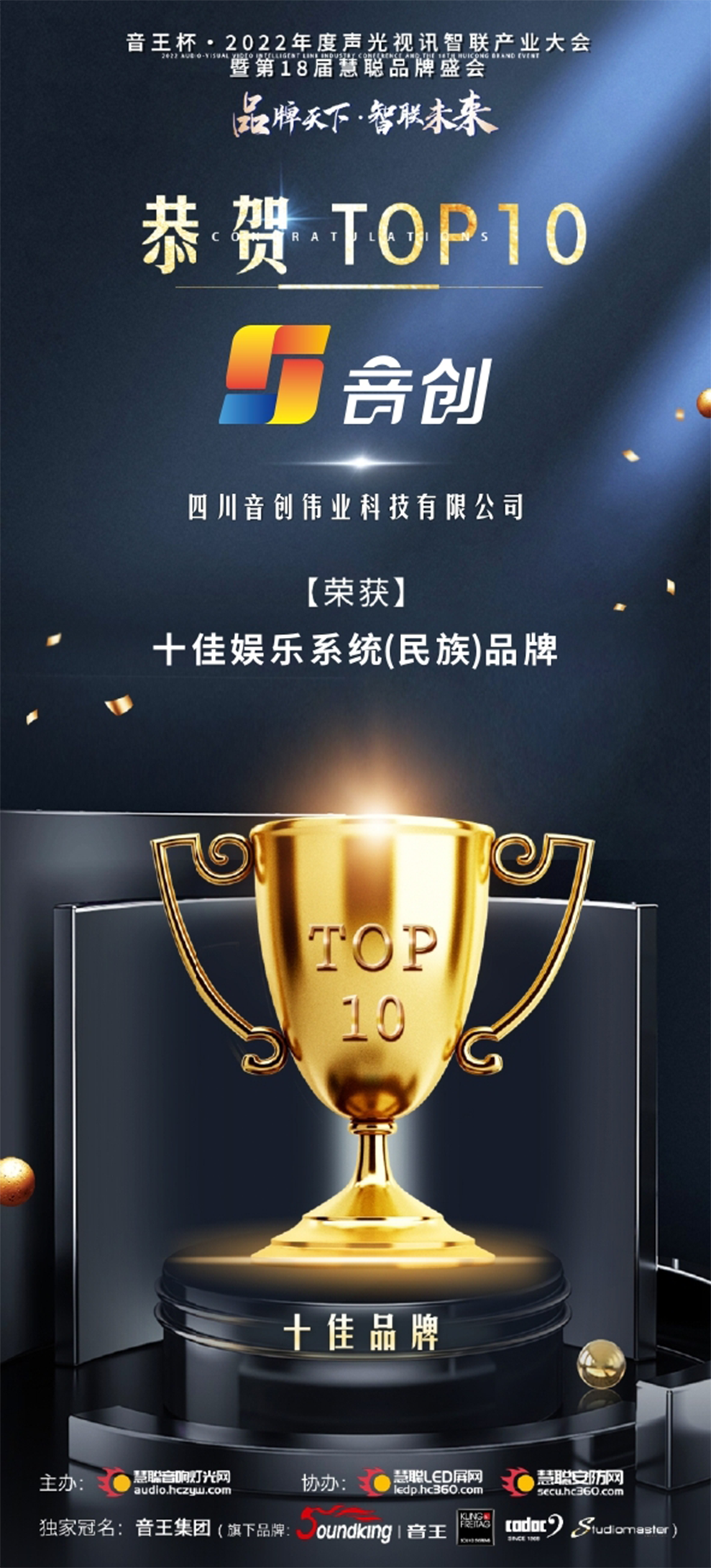 历时2个多月全方位考核,音创凭借自身品牌魅力与过硬的产品实力,在本次评选中成功斩获了“十佳娱乐系统(民族)品牌”的荣誉奖项,载誉而归。