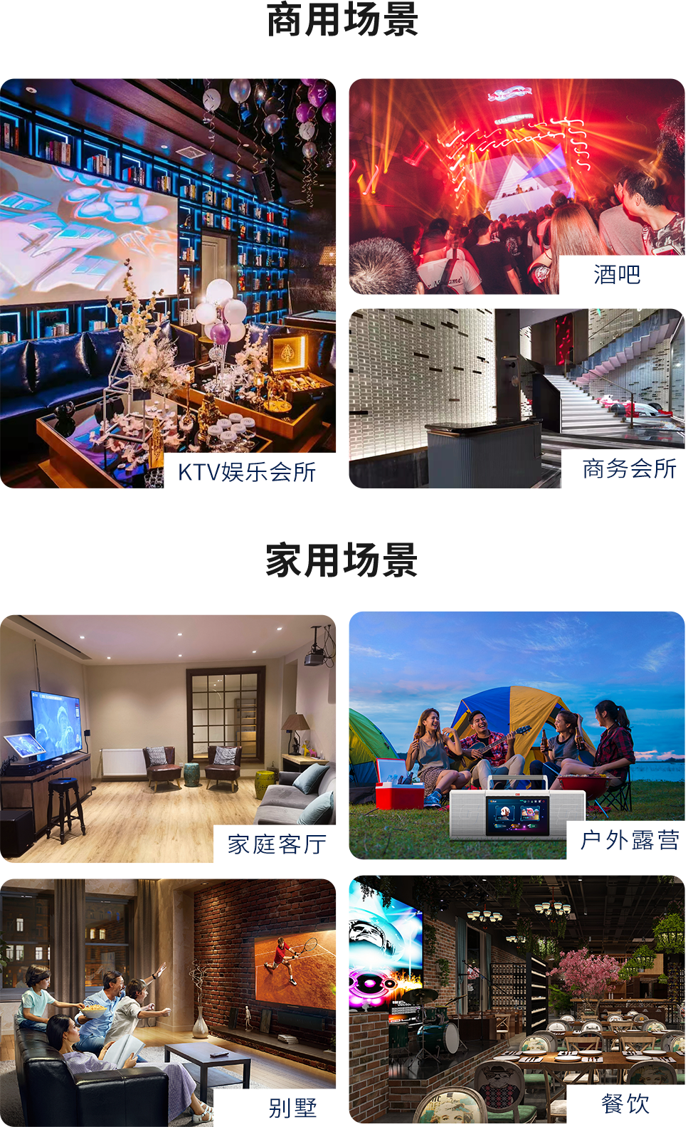 音创市场布局遍布全国及海外,其业务范围涵盖了大中小型KTV娱乐场所、商务会所、酒吧等商业娱乐场所,以及客厅、别墅、餐饮、户外露营等多个场景。