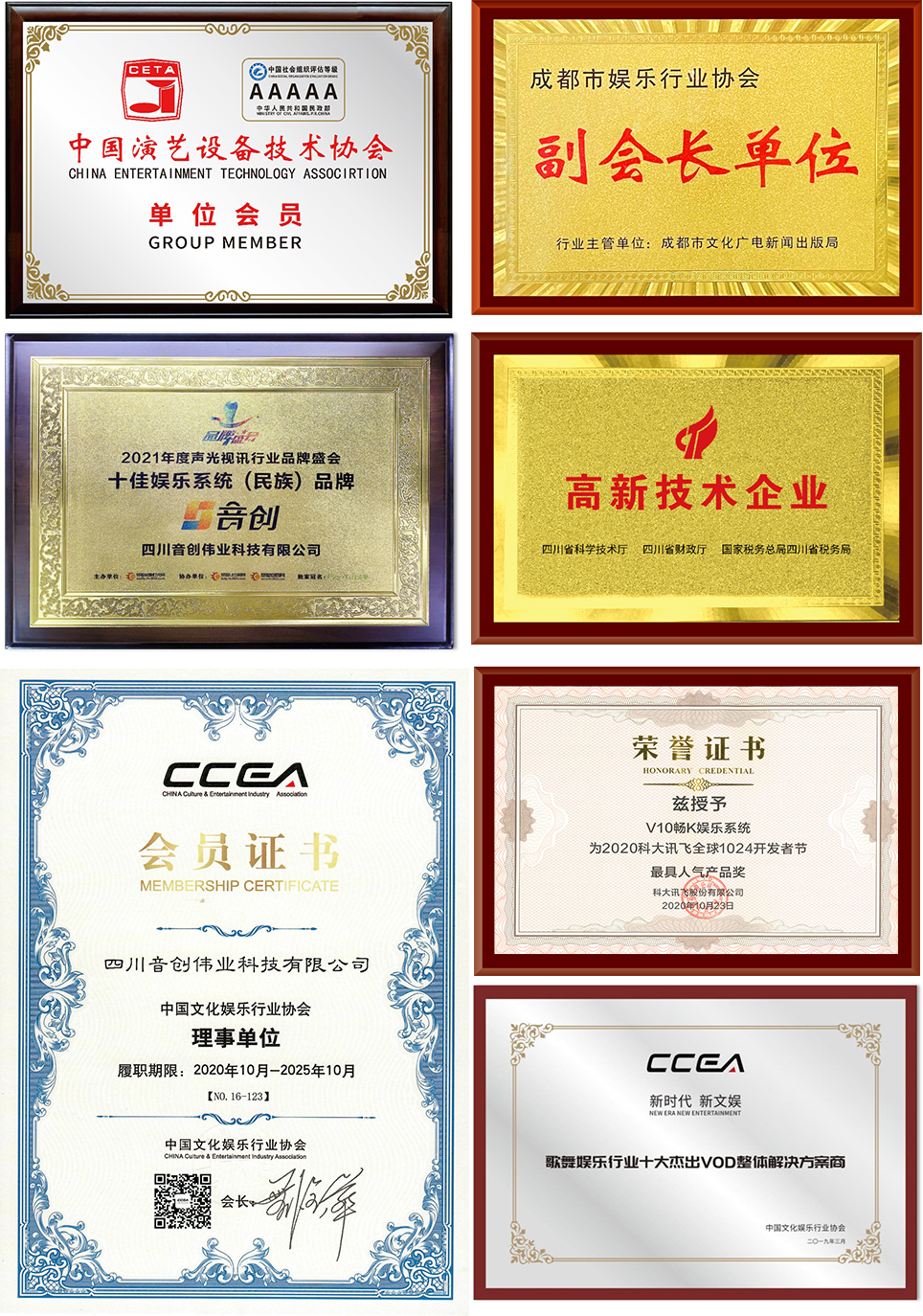 作为一家专注K歌娱乐解决方案的高新技术企业,音创凭借优秀的口碑与产品实力,成为了中国文化娱乐行业协会理事单位,也收获了中国演艺设备技术协会副会长单位、全国科技型企业、四川省软件行业协会常务理事单位、国家高新技术企业、成都高新区种子期雏鹰企业、歌舞娱乐行业十大杰出VOD整体解决方案商、十佳娱乐系统(民族)品牌、1024全球开发者节最具人气产品奖等殊荣。