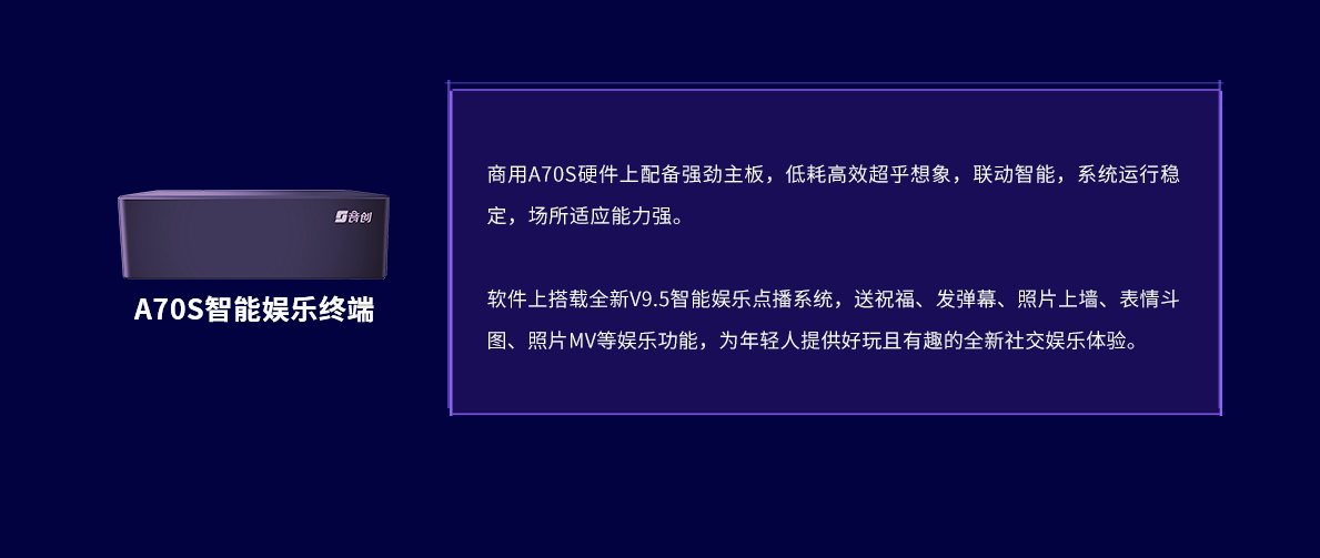 多选择智能娱乐终端,高强大配置,场所适应能力强,有效提升场所包厢经营效果,带给消费者更畅快的娱乐体验